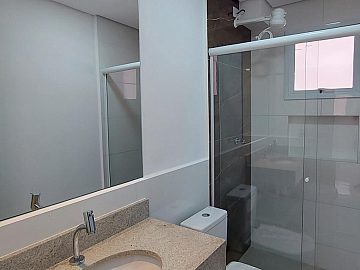 o Banheiro completo, com box, chuveiro e elegante bancada/prateleira em granito - um toque de requinte.